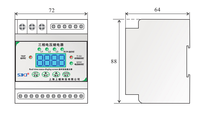 , 無數(shù)值顯示。繼電器達(dá)到所設(shè)定值,動作后,由TIRP動作燈會點(diǎn)亮,實(shí)際線路電壓低于或高于所設(shè)定的返回值,指示燈切換回來。正常運(yùn)行情況下,RUN運(yùn)行燈、電壓設(shè)置表示燈常亮。L1、L2、L3來回切換運(yùn)行。當(dāng)輸入電壓任意一相滿足動作條件,繼電器動作,電壓標(biāo)識燈熄滅,表示延時時間已到動作。當(dāng)輸入接近動作條件時,繼電器進(jìn)入動作預(yù)備狀態(tài),所有芯片資源用來計算輸入值,一旦滿足條件,立即啟動計時,繼電器設(shè)有啟動量連續(xù)判斷功能和突變量連續(xù)判斷功能,能夠有效迅速的判斷輸入值,并躲過短時干擾。HJY-93AF三相過電壓繼電器接線圖