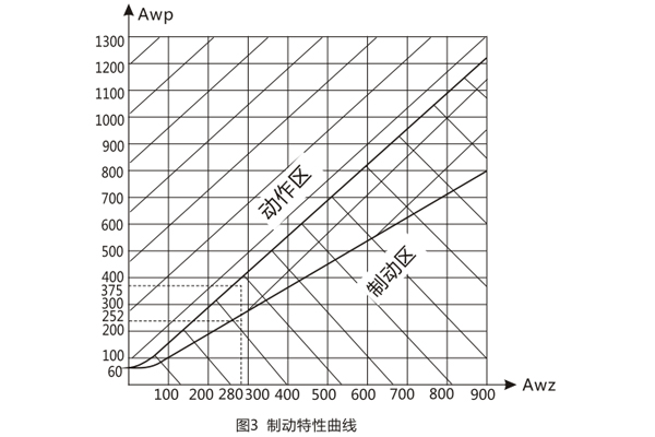 圖3為制動電流與工作電流間有不同的移相角時AWp=f(AWr)的關系曲線。 由圖3可以看出制動系數(shù)與工作電流和制動電流間移相角的關系不能超過這兩條特性曲線。