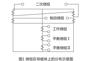 變流器的導磁體是一個三柱形鐵芯,用幾組“山”形導磁片疊裝而成,在導磁體的中柱上放置工作繞組和平衡繞組制動繞組和次級繞組則均分成兩部分,分別放在導磁體的兩個邊柱上,其連接方法應使得制動繞組與二次繞組及平衡繞組I、Ⅱ之間亦無相互感應,二次繞組里的感應電勢是由工作繞組的磁化產(chǎn)生的,為了能改變變流器導磁體被飽和的程度,制動繞組的匝數(shù)做成是可以改變的。