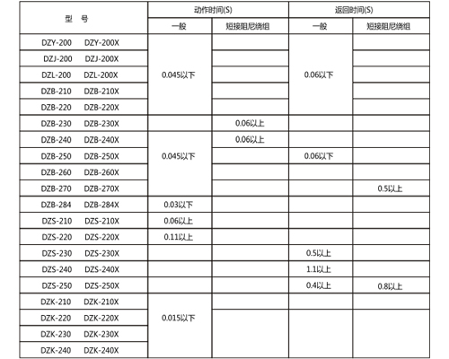 2.1動(dòng)作電壓與保持電壓不大于70%額定電壓, DZY(J)-220X動(dòng)作電壓不大于80%額定電壓;動(dòng)作電壓不小于30%額定電壓, DZK-200及DZB 243不小于50%額定電壓。